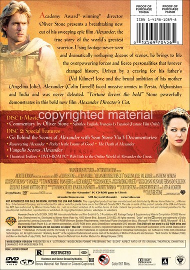 Disc 1: Commentary by Oliver Stone Disc 2: Behind-the-Scenes of Alexander with Sean Stone Via 3 Documentaries: - Resurrecting Alexander - Perfect Is the Enemy of Good - The Death of Alexander Vangelis Scores Alexander Featurette DVD-ROM PC Web Link to the Online World of Alexander the Great Theatrical Trailers |