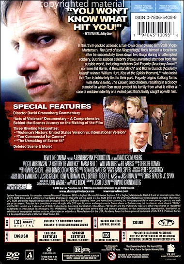 | In this thrill-packed actioner, a small-town diner owner, Tom Stall (Viggo Mortensen, The Lord of The Rings) finds himself a local hero after he successful takes down two thugs during an attempted robbery. But his sudden celebrity draws unwanted attention from the outside world, including mobsters Carl Fogarty (Academy Award® nominee Ed Harris, A Beautiful Mind) and Richie Cusack (Academy Award® winner William Hurt, Kiss of the Spider Woman), who insist that Tom is intricately tied to their past. Fogarty begins stalking Tom's wife (Maria Bello, The Cooler) and children, resulting in a bloody standoff in which Tom must protect his family from what is either a case of mistaken identity or a violent past that's finally caught up with him. |